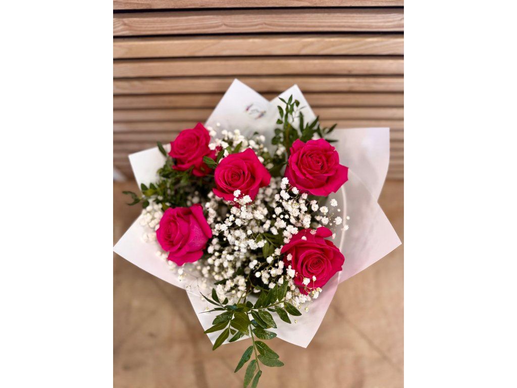 Kytice pěti něžných růžových růží, doplněná jemnou gypsophilou, dekorativní zelení a elegantní manžetou. Každá růže je pečlivě vybraná a aranžovaná tak, aby vytvořila harmonický celek plný lásky a něhy. Ideální volba jako dárek pro výjimečnou osobu nebo k vyjádření vřelých citů. 🌹