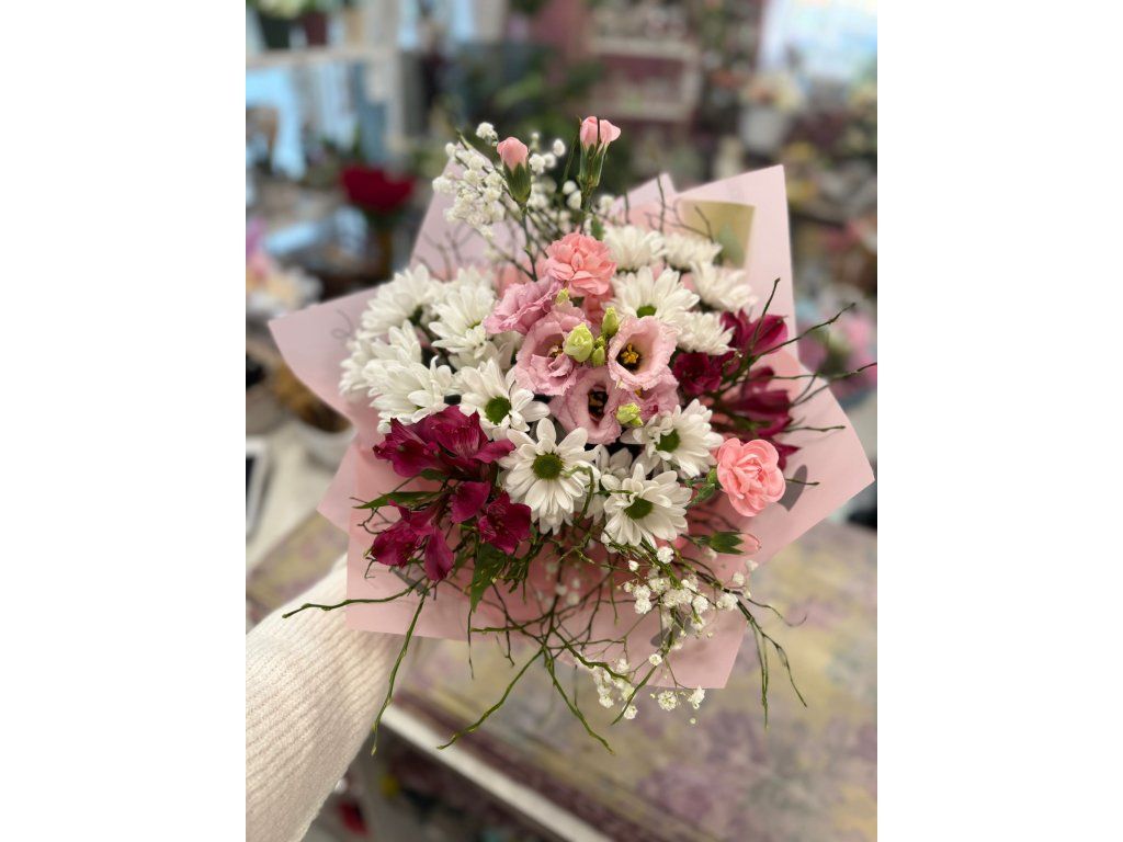 Růžová kytice z eustomy, alstromerií, trsových karafiátů a chryzantém je něžnou a elegantní volbou, která vyjadřuje jemnost, vřelost a radost. Kytice je pečlivě aranžována tak, aby jednotlivé květiny harmonicky ladily a tvořily bohaté a vyvážené celé aranžmá.